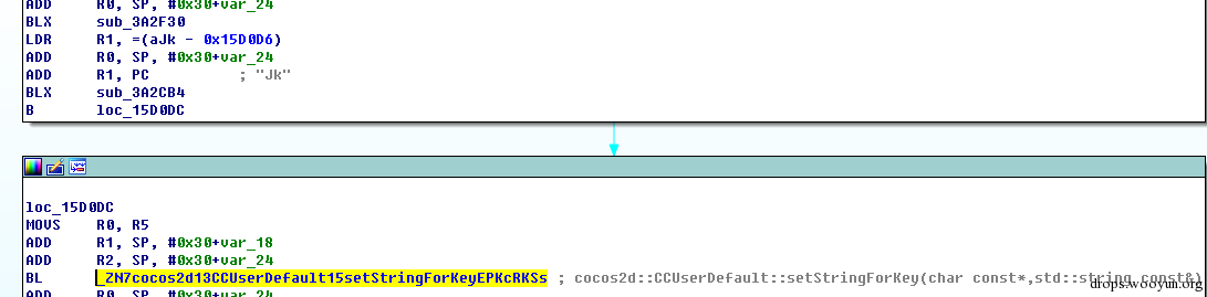根据调用找到关键函数,在_Z18setStringForKeyJNIPKcS0_中用Cocos2dxHelper进行string写入