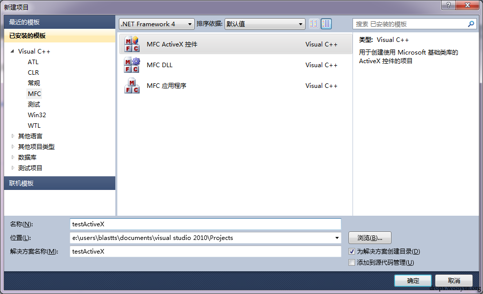 这里的具体内容在之前的一篇文章http://drops.wooyun.org/papers/5673有介绍,所以不重复叙述了。为了后续实验方便,我们可以使用环境自己先弄个ActiveX,这里以Microsoft Visual C++ 2010为例创建一个ActiveX控件。