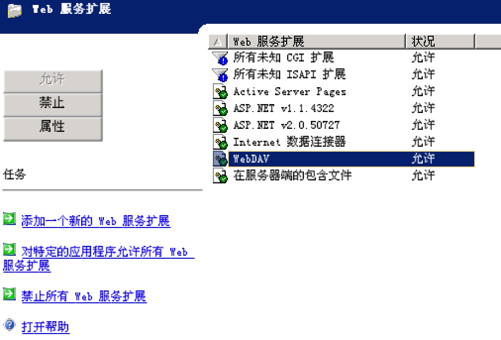 通过启动“IIS管理器”,展开本地计算机,选择“Web服务扩展”,选择“允许”的途径来启动WebDAV功能。