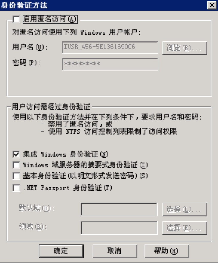 不要选取“启用匿名访问”,以免招致攻击。选择安全的验证方法,选择“集成Windows身份验证”。