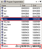 在漏洞分析中我们发现,该漏洞有一个特征,就是缓冲区溢出的数据覆盖 .data段中的全局变量。仔细分析能够发现在 .data段后面有以下段,如下图所示。