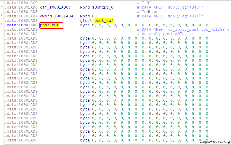 读取长度为content-length的所有POST数据到post_buf,如果读取的POST数据长度不为0,就计算post_buf中数据的长度。 这里的content-length是POST参数的长度,在调用do_apply_post函数时并没有进行校验,而该长度在使用读取数据进入内存时也没有进行校验就直接读取了POST参数,因此导致了缓冲区溢出。 我们再看看产生缓冲区溢出的内存post_buf的位置。可以看到,post_buf位于HTTPD的 .data段中,如下图所示。在应用程序中,.data段用于存放已初始化的全局变量,这里的post_buf大小为0x2710字节(10 000字节)。