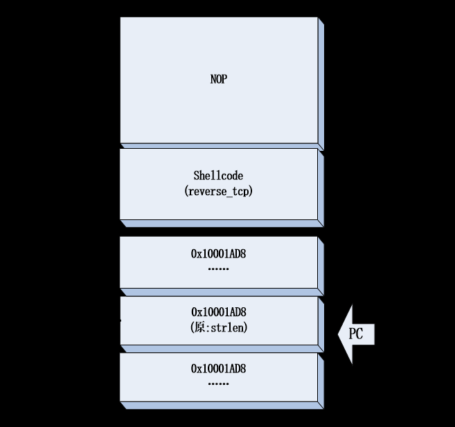 在这里,只要填充0x2F32(0x1000D7A0 – 0x10001AD8)字节的数据,就可以将原来的strlen调用位置填充为任意地址,并控制执行流程。但是,为了利用的稳定性和通用性,这里选择将strlen之后的一段数据一并覆盖,利用方法如下图所示。 在post_buf中填充NOP指令及Shellcode,将post_buf之后总共0x4000字节的数据全部覆盖为post_buf首地址,使布置的缓冲区总是能够覆盖strlen函数地址,strlen指向post_buf,如此一来,原来执行strlen的地方都会跳转到post_buf首地址去执行。这样就可以保证wfread() 函数布置完缓冲区以后,在0x004112D8处执行strlen函数时会被劫持到post_buf头部去执行我们的Shellcode了。