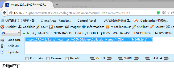 http://127.0.0.1/3.php?news=test’%26%26db.getCollectionNames().length==5%26%26’1’==’1