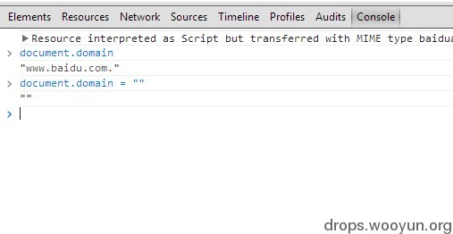 S2:在chrome下如果我们访问www.baidu.com,通过控制台来设置一下域为空,document.domain=””,就会出现以下的错误。
