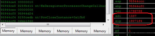Exploit执行后,我们在调试器检查内存发现, HalDispatchTable+4处地址被SHELLCODE地址覆盖, 然后SHELLCODE被执行。 下面对话框显示程序在断点处中断。