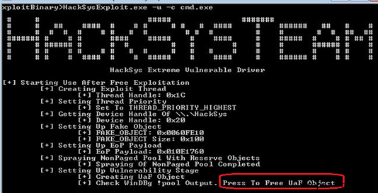 首先我们让被调试端/目标以guest权限运行。 我们首先必须在内核池分配一个弱点对象,以触发Use After free漏洞, 然后释放它并强制使程序使用这个被释放的对象。