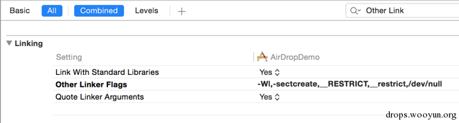 另外因为最近iOS dylib病毒也十分泛滥,为了防止开发者中招,支付宝的小伙伴还提供了一个防止被dylib hook的小技巧:在Build Settings中找到“Other Linker Flags”在其中加上”-Wl,-sectcreate,__RESTRICT,__restrict,/dev/null”即可。