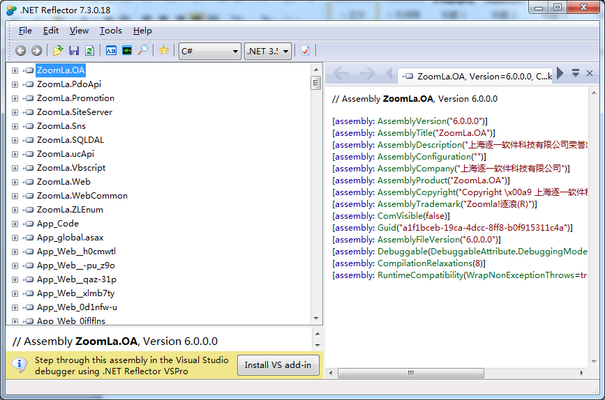 Reflector是一个比较早出现而且功能也比较强大的反编译软件(在这略微提醒一下,是反编译不是反汇编),支持自定义插件和代码调试的功能,支持将源码反编译为IL语言、VB.NET、C#、Delphi.NET、F#和MC++等并可选择.NET框架的相关版本(不同版本有不同的语言特性),目前最新版已经是8.0,7.3版的截图如下: