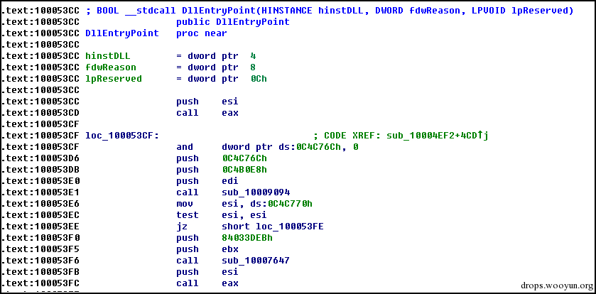 程序最终会执行到primarydll的入口处,primarydll的入口处代码,会执行sub_100122B6()函数,查看此函数的代码。