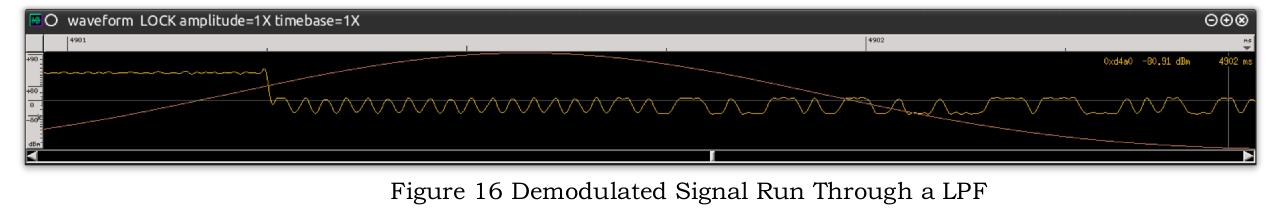 通过上图对我们解调过后的信号进行观察,我们可以发现一些很有价值的信息。首先我们可以从图中,看到我们获取的信号并没有我们预期的那么干净。其次,波形图整体偏下,且并没有穿过中心轴(X-axis).然而这些对于我们将无线电信号转换成0和1是十分的不利的。为了实现信号的转换我们需要在Quadrature Demodulation和File Sink blocks之间加入另外一个LPF。就像在之前所提到的那样,这个模块需要我们配置它的“Cutoff Freq”和“Transition Width”变量。然而问题是,现在还并没有什么好的文档能告诉我们该如何去设定这个LPF当中的这两个变量。这些变量的取值一般可能会受到频率,Modulation和其它一些配置的影响。根据经验,我们通常会从100,000开始设定“Cutoff Freq”并将“Transition Width”的设置为它一半的值。通过重复调节这些参数并将输出文件导入到Baudline进行观察,再经过几轮甚至是更多次的调试之后我们将会在Baudline当中看到看上去更像是数据的波形图。图16中的波形图,就是我们将“Cutoff Freq”设置成80,000,“Transition Width”设置成50,000后的结果。