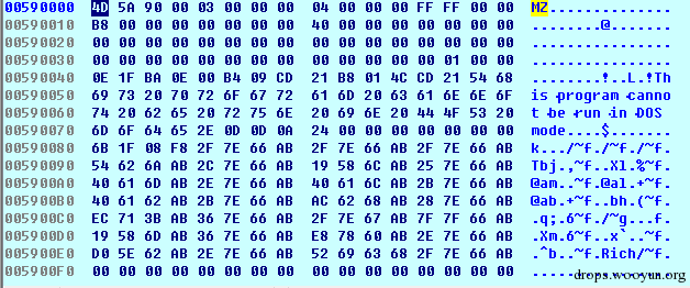 其解码方式同样比较简单,是逐字节与0xCC进行异或运算。当完整所有解码工作之后,可以发现解码之后的内存为一个完整的PE文件: