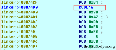 这里就是我说的很重要的问题了,上面我提到了,被调试的程序可以在3种指令集之间切换,这时的IDA并不知道当前要变成代码的地址是ARM还是THUMB,这时我们需要对照静态的来看,或者你对指令集绝对的熟悉,看到BYTE CODE就知道是哪种指令集