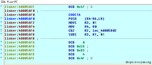 问题又来了,奇怪了,为什么下面不是指令?!这个是IDA的BUG,6.6版本对THUMB2指令在调试状态的解析就是有问题。。。。,不过没关系,我们往下看